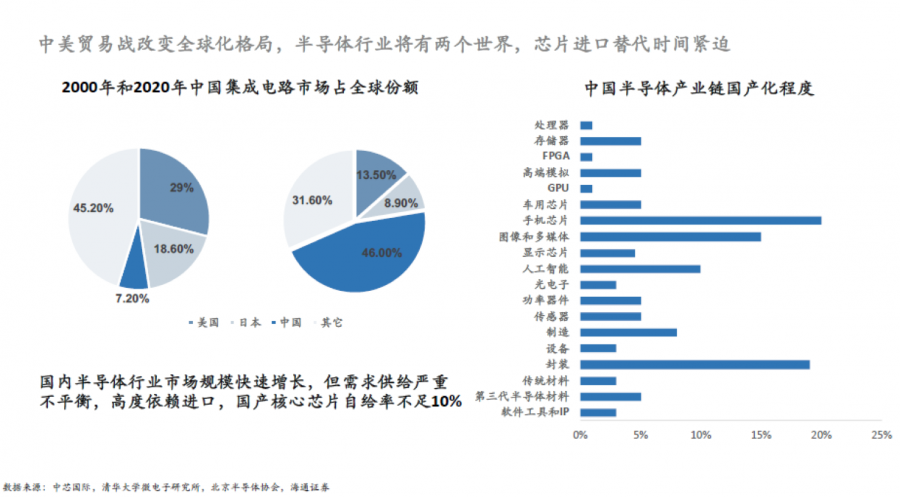 1)根據(jù)半導(dǎo)體發(fā)展歷史和規(guī)律,中國必將承接全球半導(dǎo)體第三次遷移。中美貿(mào)易戰(zhàn)愈演愈烈,全球半導(dǎo)體行業(yè)格局悄然改變,芯片進(jìn)口替代時間緊迫,提高國內(nèi)核心芯片自給率迫在眉睫。目前,國內(nèi)非常重視半導(dǎo)體企業(yè)的發(fā)展,且我國現(xiàn)狀是由需求帶動銷售的增速逐漸超過全球。